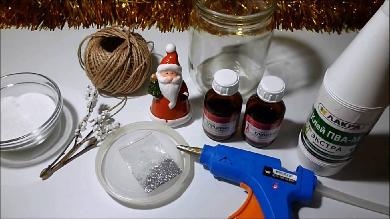 Для снежного шара необходимы следующие материалы: красивая стеклянная баночка с плотной крышкой, дистиллированная вода, глицерин, термопистолет, различные блестки, клей ПВА, соль, лента, фигурки в стиле нового года: Дед Мороз и веточка.
