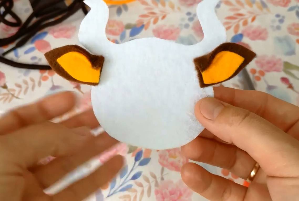 Шаг 2: Внутреннюю оранжевую часть уха приклеить к коричневой внешней и слегка подогнуть 1 уголок у основания. То же самое проделать со вторым ухом. Приклеить оба уха краешками к голове из белого фетра.