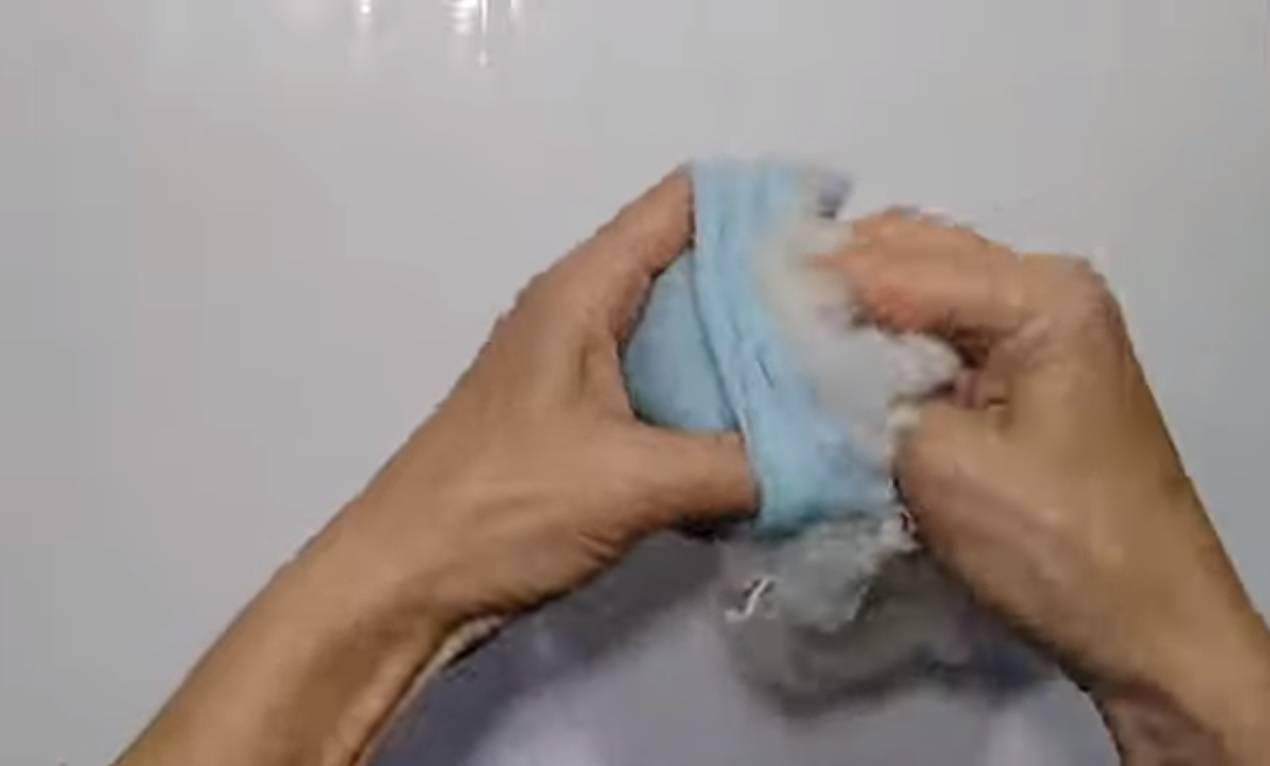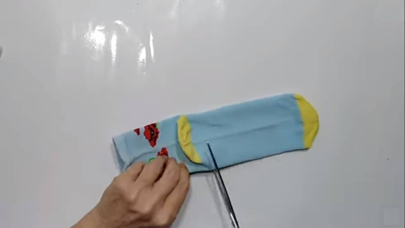 Шаг 7: От остатков носков отрезать небольшую полоску, с помощью ножниц разлохматить одну сторону этой веревочки и пришить сзади игрушки на место хвостика.