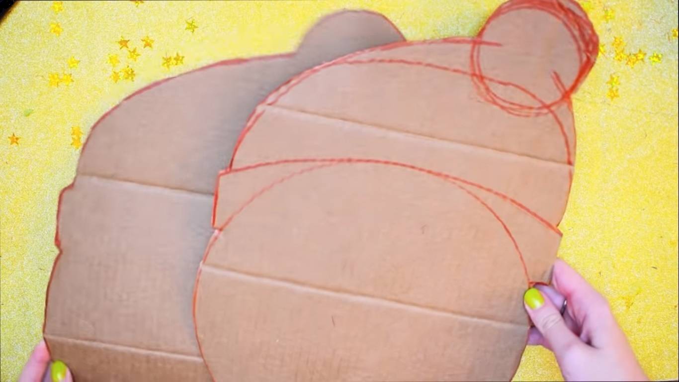 - Вырежьте из тонкого бежевого фетра детали – оторочку шубки и шапки.