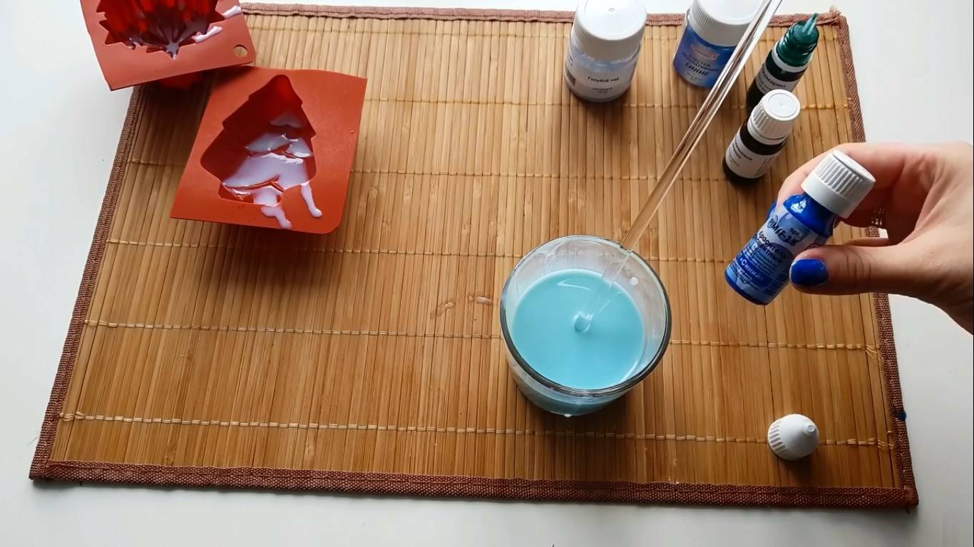 Шаг 2: Подготовить мыльную основу. В ёмкость с основой добавить 10 капель пигмента «Аквамарин» и 5-6 капель синего пигмента, всыпать немного синих блесток и добавить несколько капель отдушки.