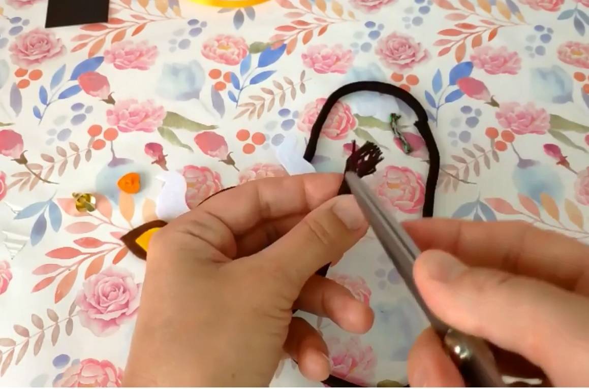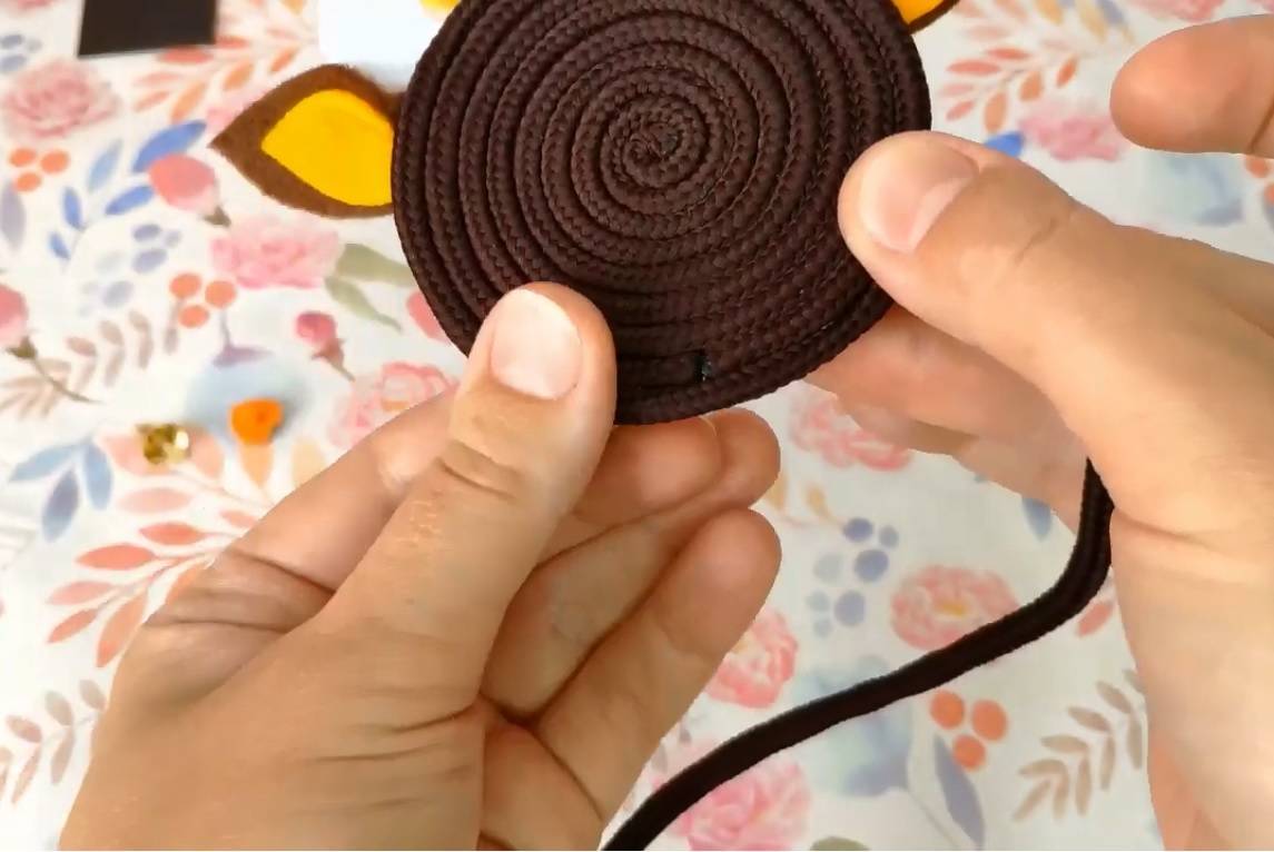 Шаг 4: Шнурок отрезать на расстоянии 5 см от основания из фетра, этот свободный конец шнурка будет служить хвостиком. Вытащить сердцевину на 2 см и отрезать её, конец шнурка слегка распушить.