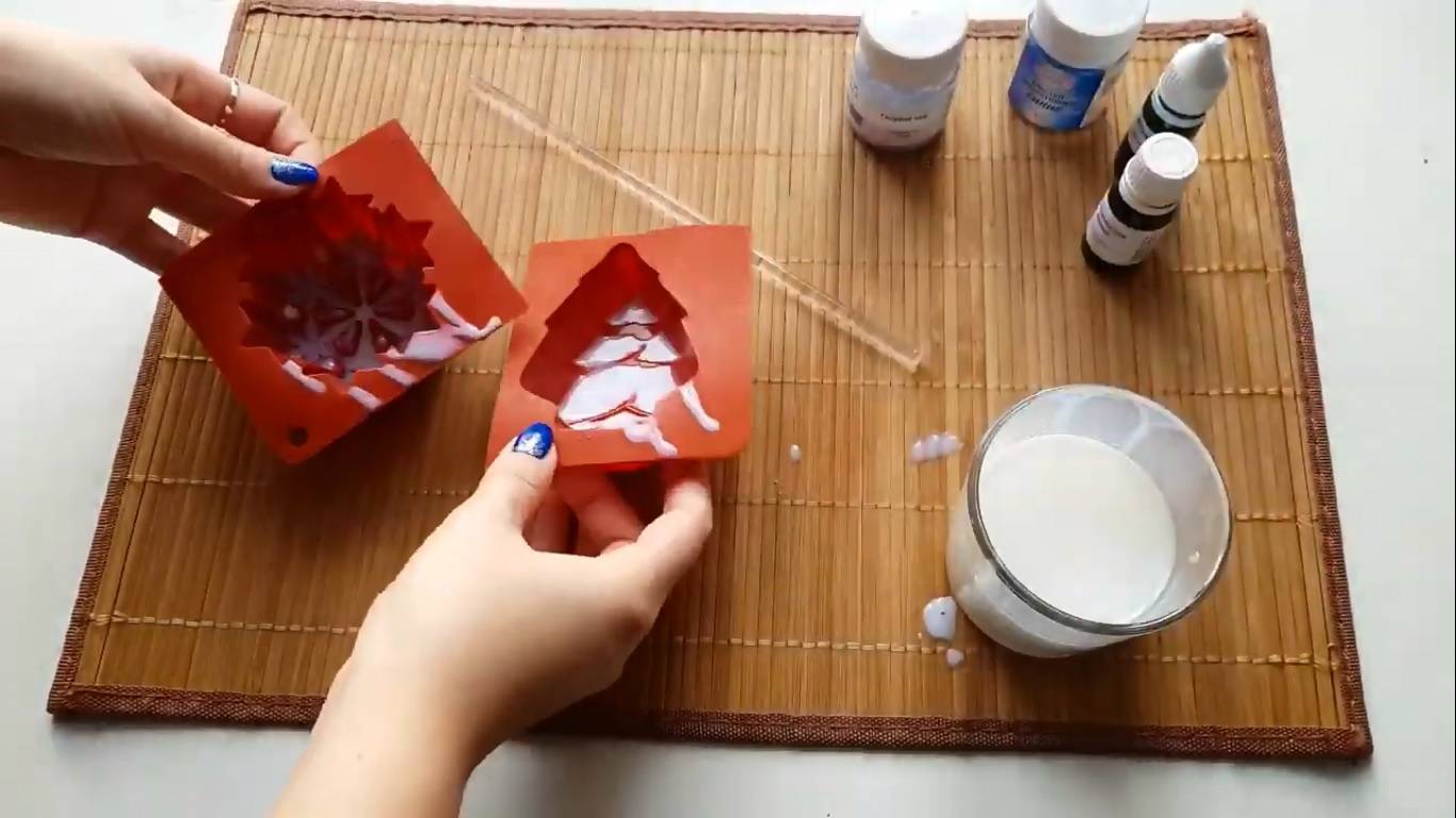 - После застывания аккуратно вынуть мыло из формы. Упаковать готовый подарок можно в бумагу, прозрачную пленку, коробочку в новогодней тематике или обернуть тонкой мешковиной, к которой привязать засушенные цветы.