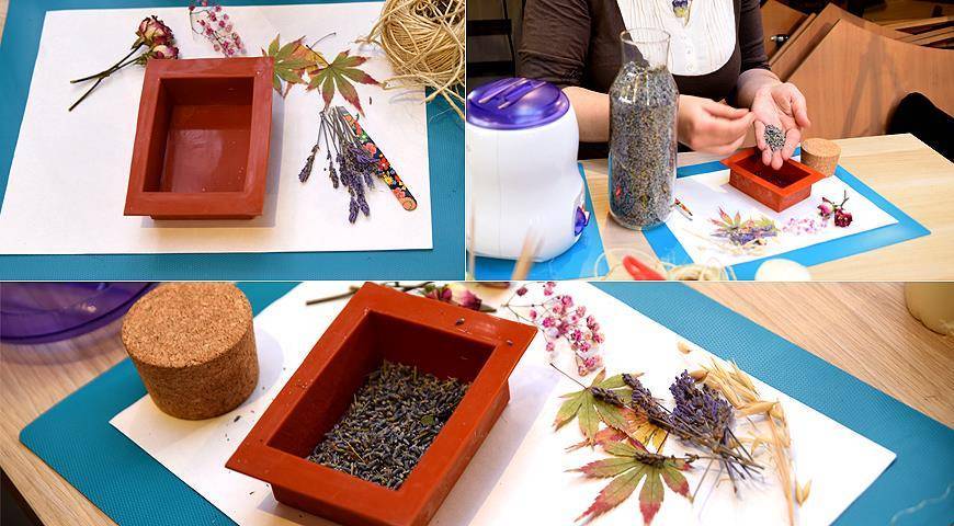 Первым делом засыпаем в нашу форму сухую лаванду. Это позволит создать красивую обратную сторону и основу для будущего цветочного “рисунка”.