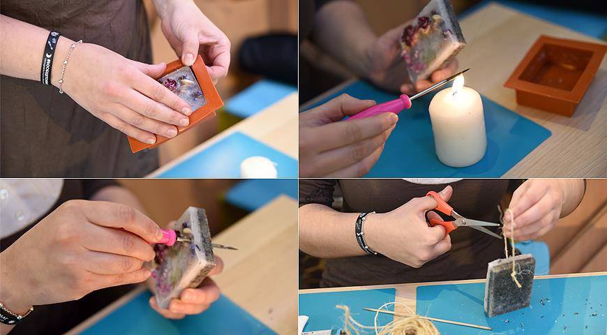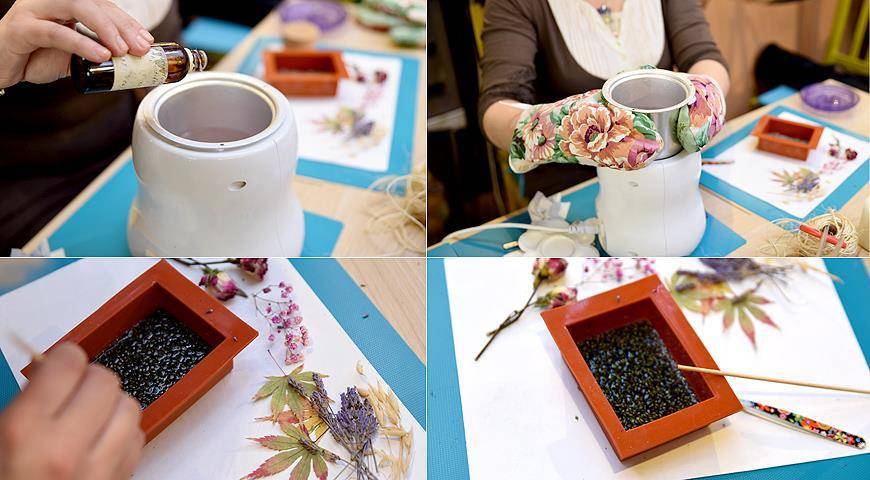 Растопленный воск разлить по формам. Когда воск немного схватится снизу, сверху саше украсить цветами, чтобы не утонули, закрепились на поверхности.