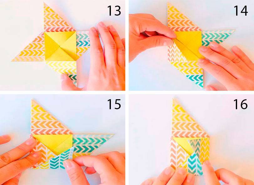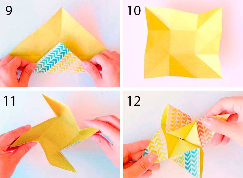 - Выпрямляем лист и начинаем складывать с маленького треугольника по сделанным ранее сгибам.