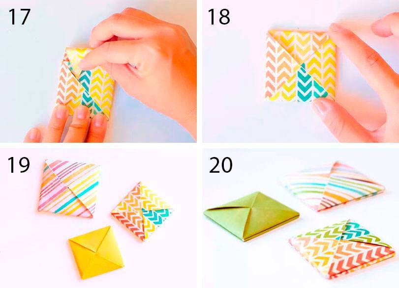 Нижнюю сторону подгибаем вверх, она закрывает центр так, чтобы ее можно было приклеить к двум подогнутым углам.