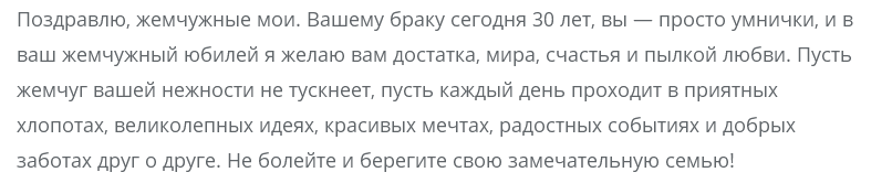 Хотим поздравить вас с днем свадьбы и пожелать, чтобы вы и дальше сохранили ту любовь и нежность, которая все эти годы была с вами. Чтобы вы продолжали находить компромиссы во всех спорных ситуациях, как делали это и раньше. И чтобы ваши дети были счастливы и создали такие же крепкие семьи, как и ваша.