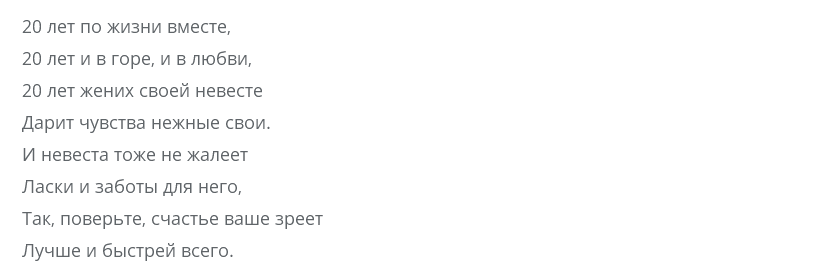 Ситцевый справляя юбилей, Как и ткань, чем проще, нем милей, Будьте друг для друга долгий срок. Старт хорош, медовый год истек…