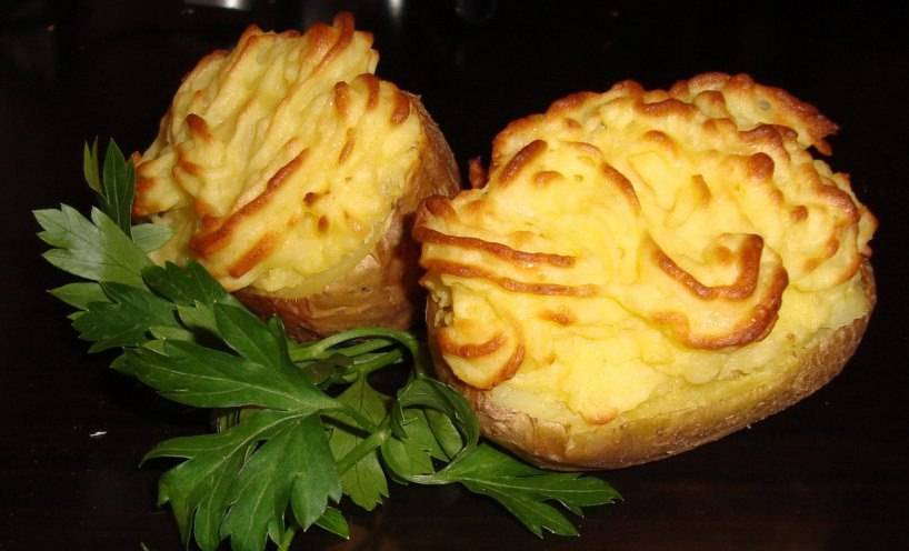 - Приготовленной смесью наполнить картофельные половинки, сверху нанести рисунок с помощью кондитерского пресса с желаемой насадкой (или просто красиво выложить вилкой). Поместить в разогретую до 250 град. духовку, запечь до золотистого цвета.
