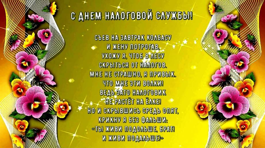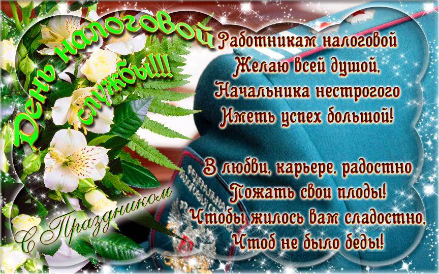С Днем налоговика всех васЯ сердечно поздравляю.Платежи от счастья ВамПолучать всегда желаю.