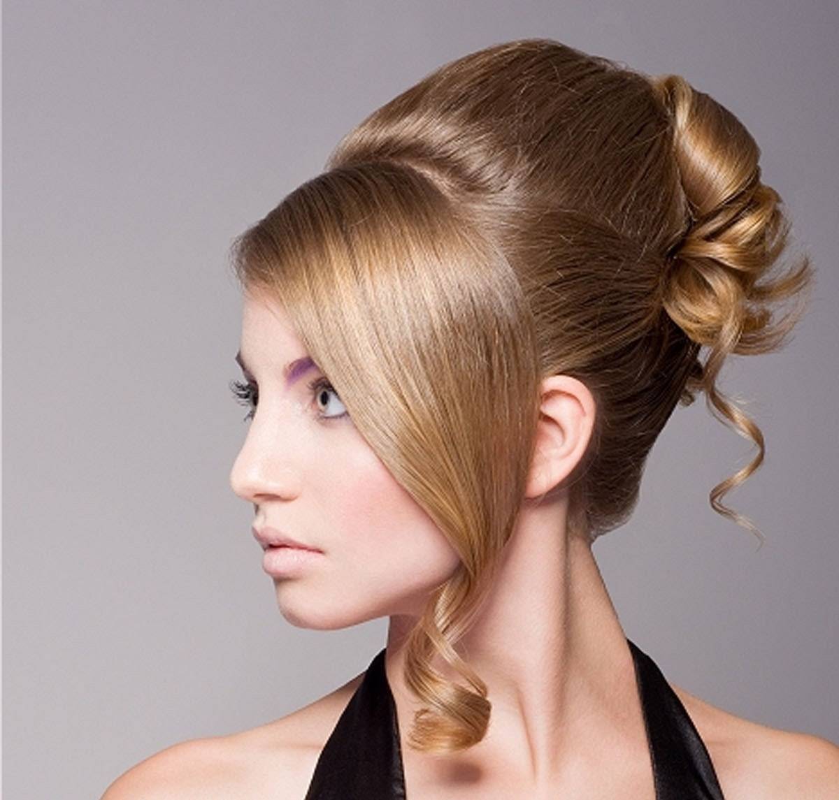 Третий этап новогодней модной прически : верхний слой волос с помощью руки и растески пригладьте, вспрысните небольшим количеством лака. Самая сложная часть прически: сверните внутрь хвост, форменную шишку закрепляем невидимками. Пряди, которые остались недейственными, мы можем превратить в настоящий шедевр.
