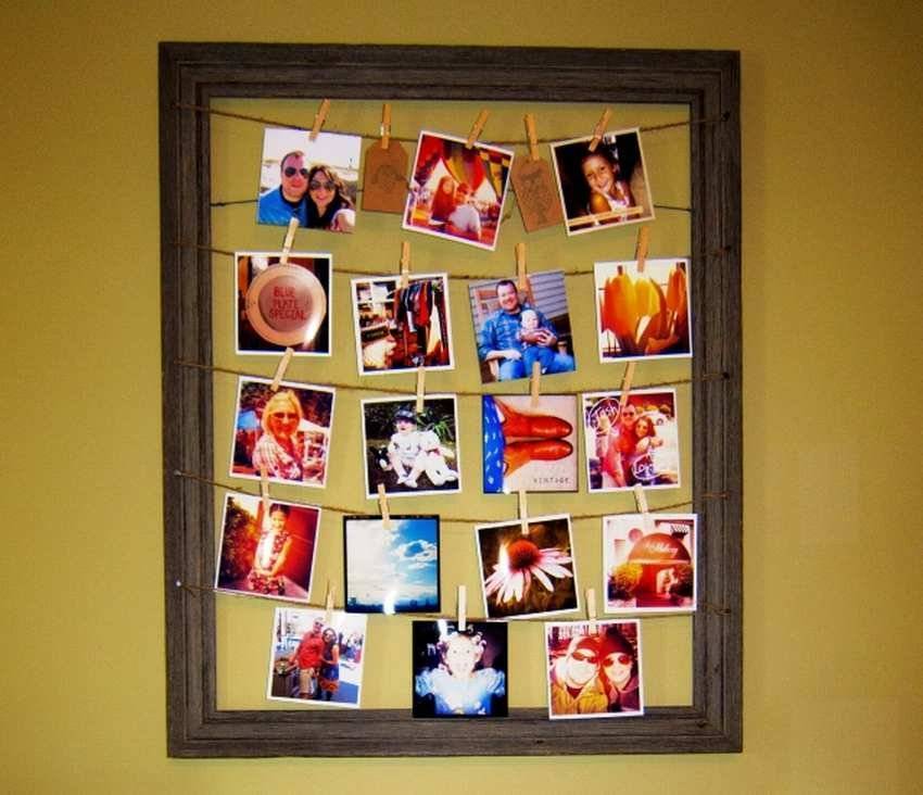 Поклонники дизайнов с фото в интерьере могут креативно изменить стиль, разбавив оформление интересным размещением на стенах фотографий. Один из таких вариантов: на бельевой верёвке, предварительно окрашенной в подходящий цвет, прикрепить фото при помощи декоративных прищепок. Рамки можно менять периодически в зависимости от настроения.