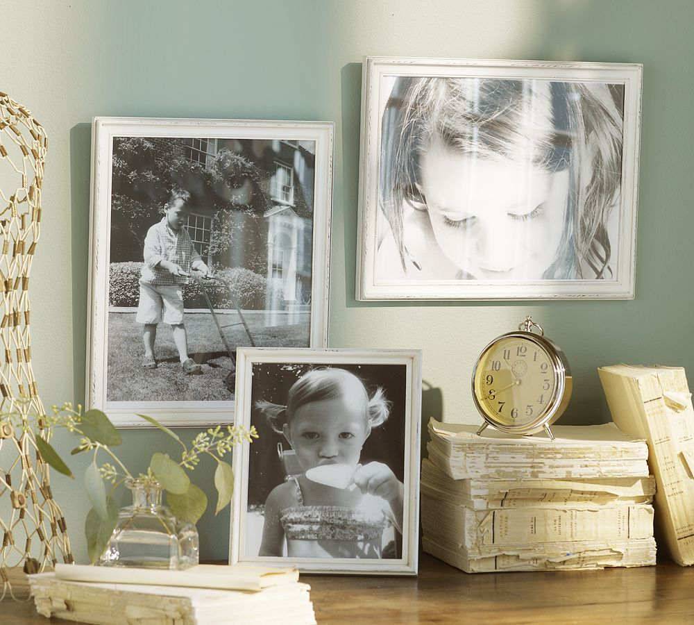 Украшать фотографиями можно любую комнату в доме или квартире. Главное, чтобы выбранный принцип и стиль соответствовал общему духу помещения и перекликался с ним по цветовой гамме и настроению. Если вы не хотите морочиться с формами и размерами, можете действительно купить одинаковые рамки. Но в таком случае их должно быть много, чтоб облицевать ими всю стену, как плиткой. Так можно украсить прихожую или кабинет.