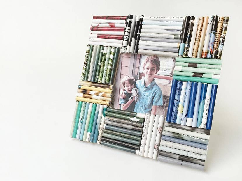 Оригинальный вид имеет отделка паспарту из бумажных трубочек. Перед тем, как украсить рамку, подготавливают необходимые материалы. Из старого журнала нарезаются полоски шириной, равной ширине рамки. При помощи вязальной спицы каждая полоска сворачивается в трубочку, а край заклеивается.