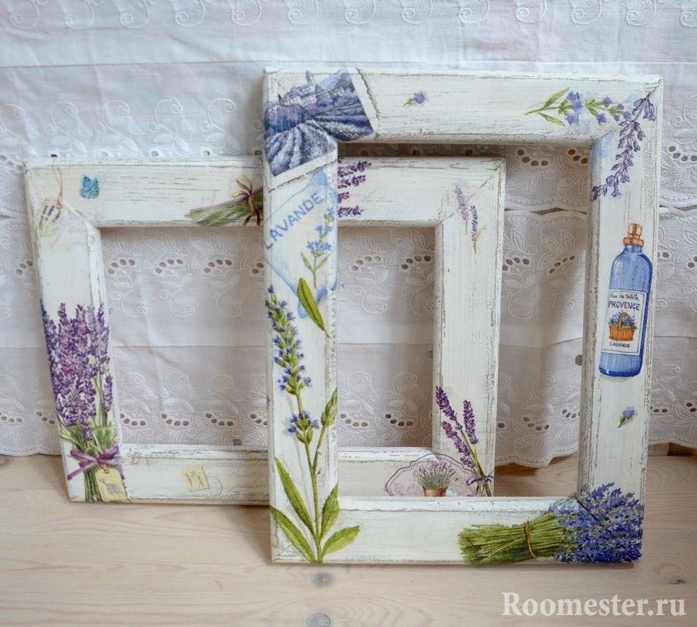 Окрашивание. Рамку из любого материала проще всего покрасить аэрозольными универсальными красками; при этом удобно использовать трафареты. Возможно применение различных техник; к деревянной поверхности применяют эффект состаривания.