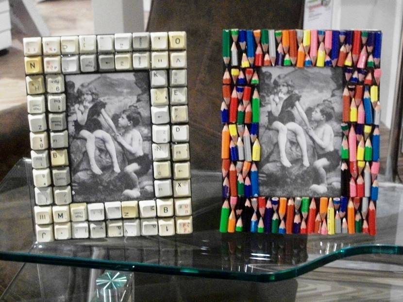 Оклеивание — популярная разновидность декора. Самодельные рамки, оклеенные неожиданным материалом, от бутылочных крышек и карандашей до кнопок от старой клавиатуры, становятся отличным подарком для друзей.