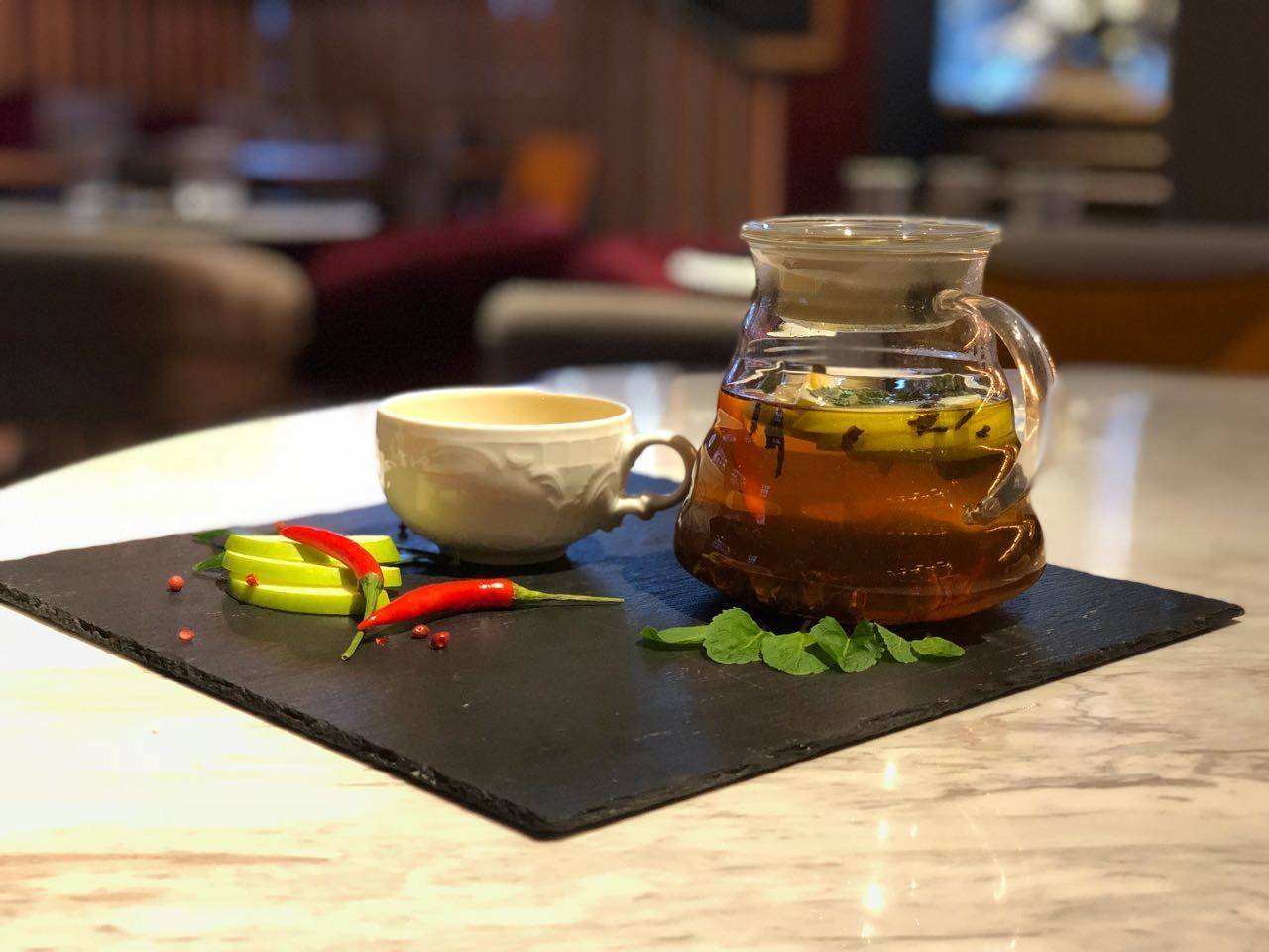 Безалкогольный согревающий напиток – для тех, кому еще предстоит сесть за руль, или кто просто не может позволить себе в эти дни спиртосодержащие напитки. Им поделилась бар-менеджер заведения «Кафе Дружба. Мануфактура Еды» Наталья Манжина. Согревающий эффект достигается за счет перца чили, который, завариваясь, передает свою остроту и аромат свежему яблочнно-мятному чаю.