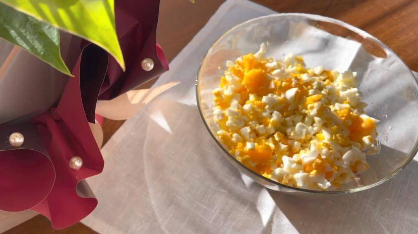 - Сварите яйца и мелко нарубите их. Переложите в емкость с рыбой.