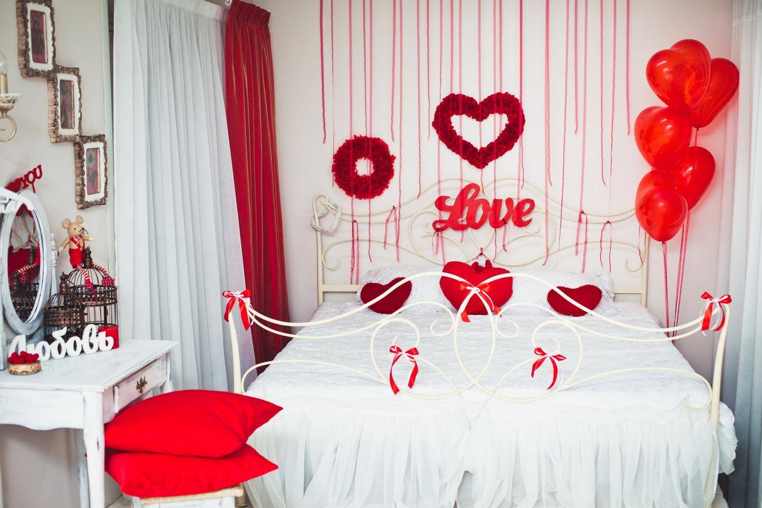 Если времени совсем мало и что-то покупать нет возможности, то украсить дом в стилистике романтичного игривого праздника можно совместными фотографиями. Их нужно прикрепить к стене в форме сердца или разложить на покрывале кровати. Не лишним будет дополнить композицию одной розой или лепестками по краю сердца.