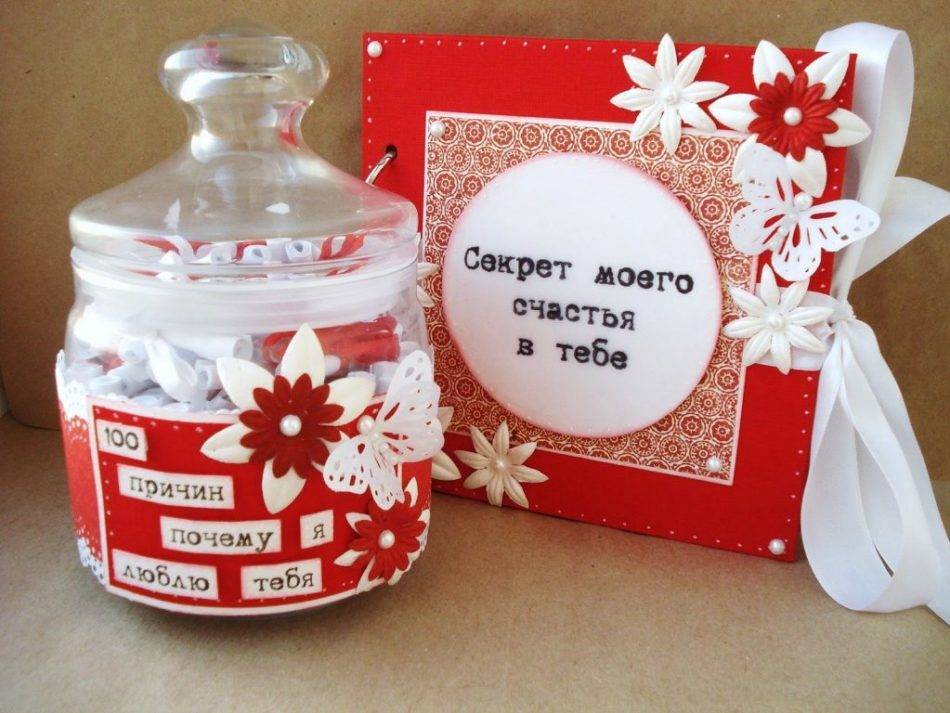 - Банка с признаниями или 100 причин, почему вы любите вашего молодого человека. Один из самых оригинальных и милых подарков. Сделать такое очень легко. Нужно взять баночку с крышкой или какую-нибудь красивую коробку, затем нарезать бумагу одинакового размера и написать на ней причины. Затем скрутить в трубочку или согнуть их несколько раз, пересыпать в выбранную емкость. Подарок готов.