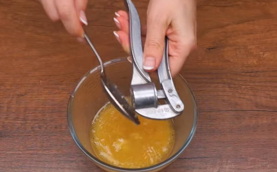 Чеснока 2-3 зубка будет достаточно, выдавливаем его через пресс.