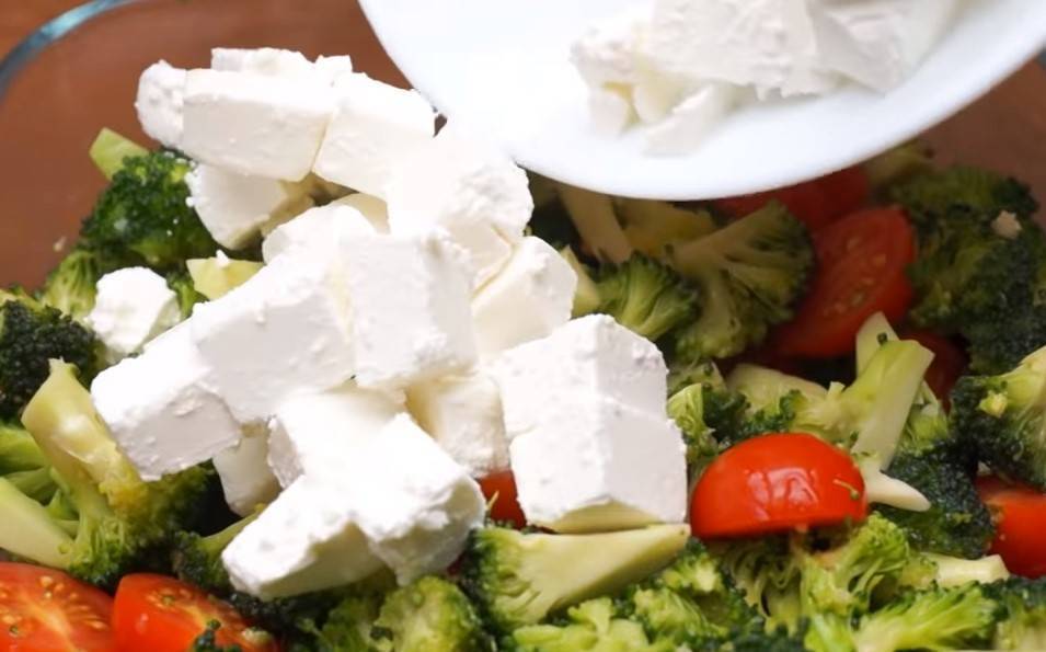 8. Порезанные ингредиенты выкладываем к брокколи и аккуратно все перемешиваем, стараясь не повредить кубики сыра.