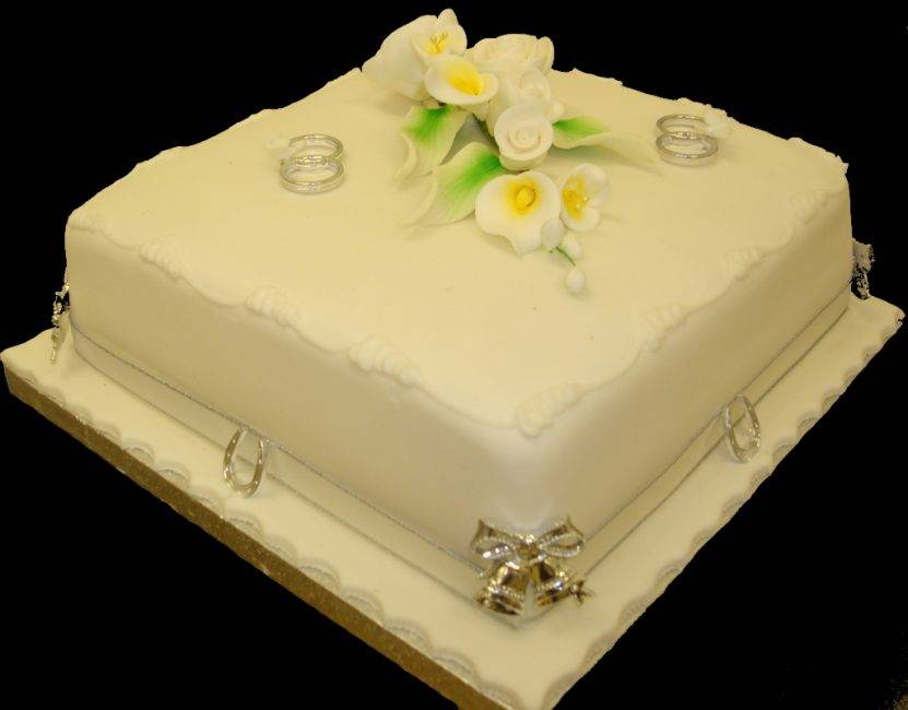 • Торт с мастикой – более традиционный вариант для классической свадьбы. Обычно такие образцы украшают айсингом – узором по ярусам, ягодами, цветами и другими декоративными элементами