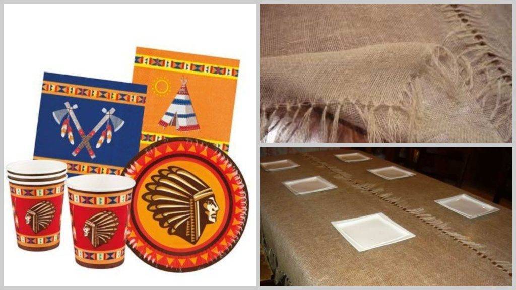 Главным достоинством индейских блюд является их простота. Простота в подаче и приготовлении.Стол накрывается скатертью с орнаментом, либо с простыми геометрическими рисунками. Если от костюма индейца осталась неиспользованная ткань — мешковина, она так же подойдет в качестве скатерти на стол. Постелив мешковину на стол, необходимо ее прогладить утюгом, а так же по краям сделать бахрому. Приборы на столах – чем проще, тем лучше. Отличный вариант – тематический пластмассовый набор посуды. С таким набором и мороки меньше — не разбивается, и не нужно тратить время на мытье посуды после праздника.