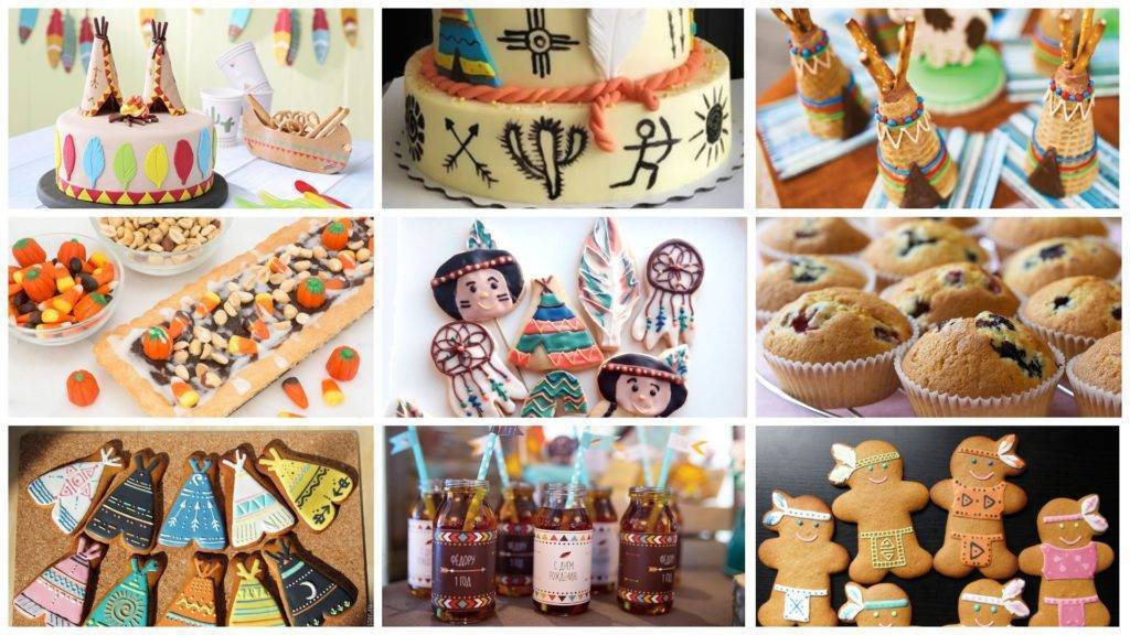 Поэтому сладкой части угощений придется уделить большее внимание. Подготовьте пирожные или маффины, добавьте к ним разноцветные индейские перышки, можно сделать шоколадное печенье, нанеся на каждое из них изображение индейца, либо трафареты с различными символами, либо с одним, например, стрелой