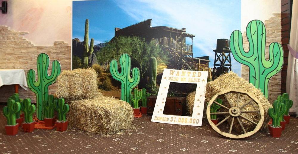 • Украсить вечеринку в стиле вестерн очень просто. Стены зала можно украсить черно-белыми фото выпускников и оригинально их подписать. К примеру, под фото девочек написать: Разыскивается красотка, которая разбила сердце Смельчаку Ронни. Также можно оформить оригинальную фотозону в стиле Дикий Запад.