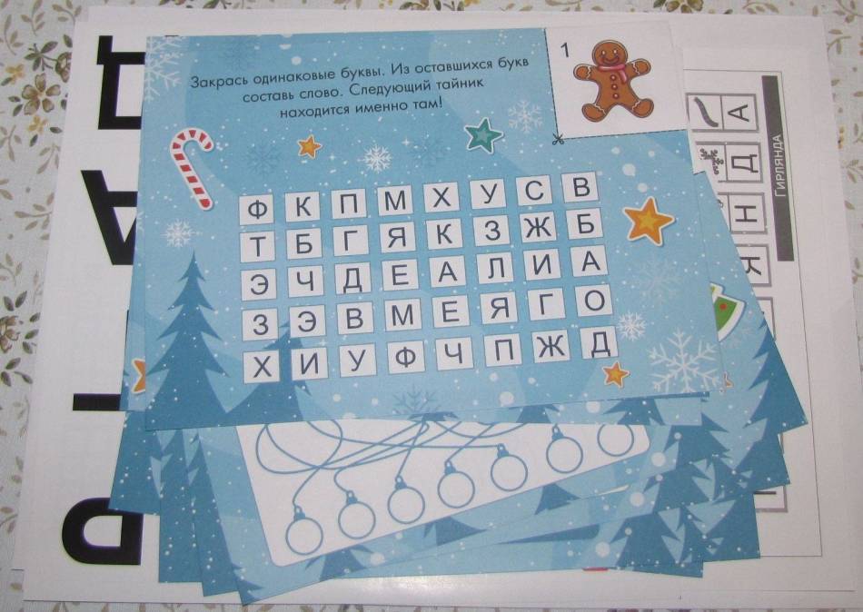 - Необходимо продумать и красиво оформить загадки, задачи или ребусы. Разложите все задания по местам. Поставьте на них номера, чтобы не забыть, и не запутаться. Помните, что оптимальное количество заданий 7-10.