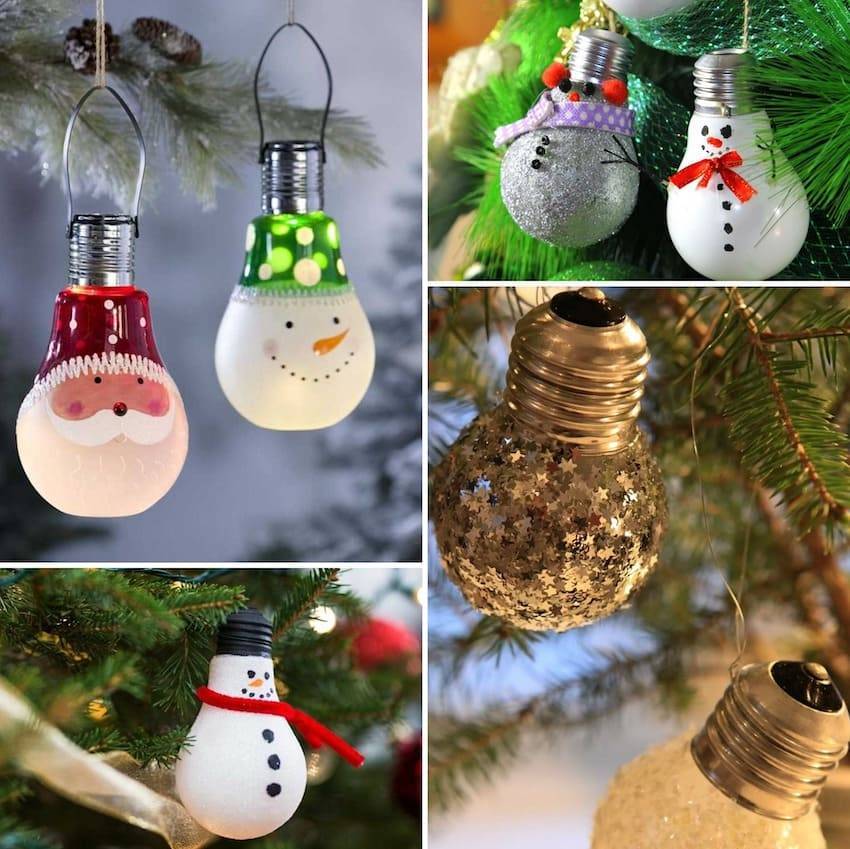 Игрушки из лампочек. Отслужившие свой срок электрические лампочки смогут послужить основой для оригинальных елочных игрушек. Их расписывают, создавая разнообразные яркие образы. После высыхания рекомендуется поверхность покрыть для устойчивости тона лаком. В качестве дополнительного декора выступают бусинки, мишура, тесьма, бисер и пр.