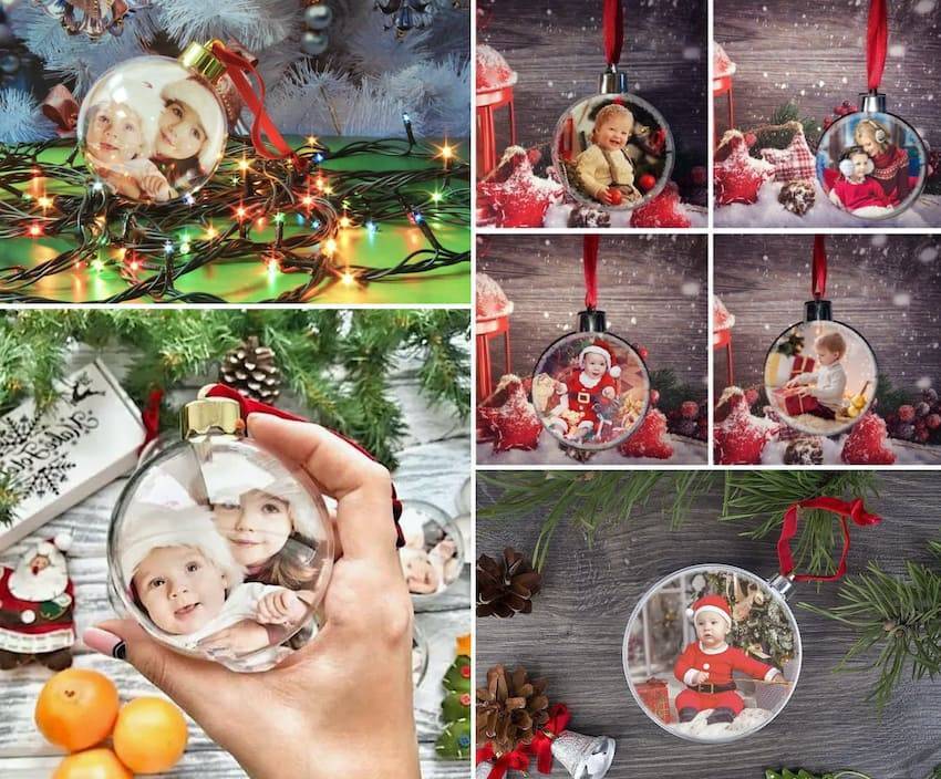 - Елочные игрушки с фотографиями внутри – Вырежьте фото под размер елочного шарика. Вложите в шар, прикрепите к нему петельку.