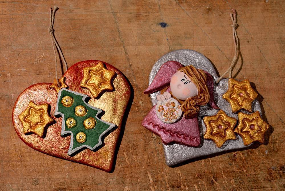 Для создания своими руками необычных подвесок на елку из этого материала, достаточно использовать скалку, вырубки для печенья и краски. Тесто нужно раскатать не слишком тонко, вырезать из него формочками заготовки, высушить их в духовке или при комнатной температуре, а затем раскрасить.