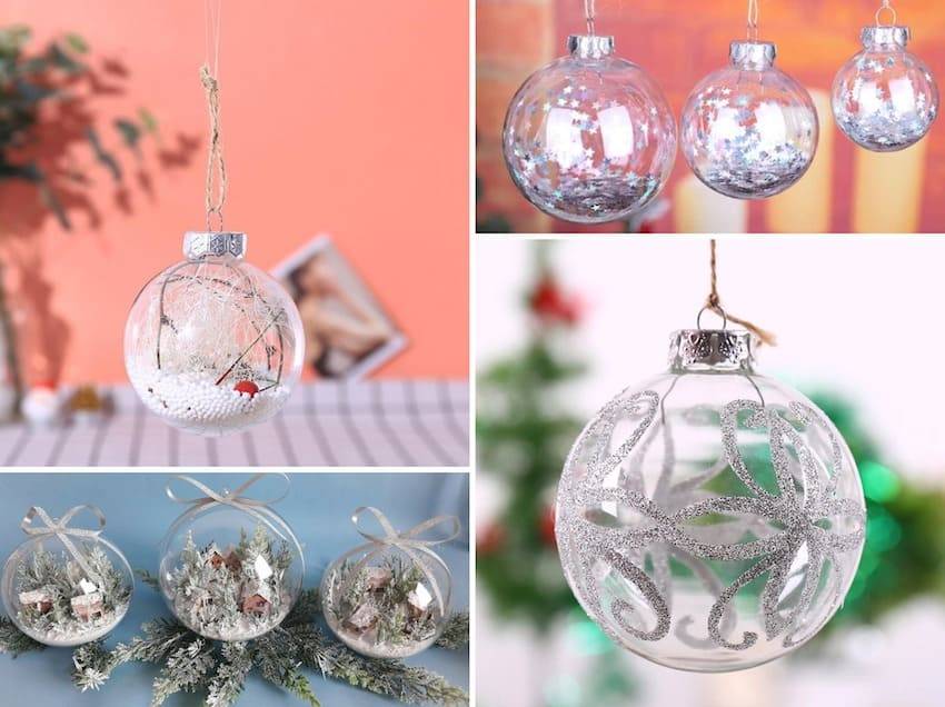 Выбирают из имеющегося дома ассортимента елочных игрушек прозрачные достаточно объемные шарики, домики, шишки