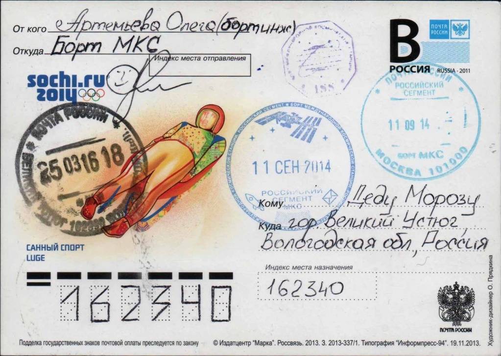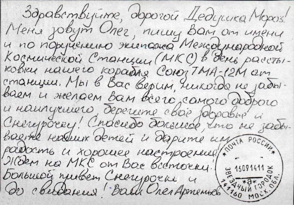 В марте 2016 года его лично доставил адресату Герой России летчик-космонавт Олег Германович Артемьев, дважды побывавший в космосе. На письме-открытке Деду Морозу вы увидите штампы, подтверждающие путешествие послания с околоземной орбиты на Землю, на родину Деда Мороза.