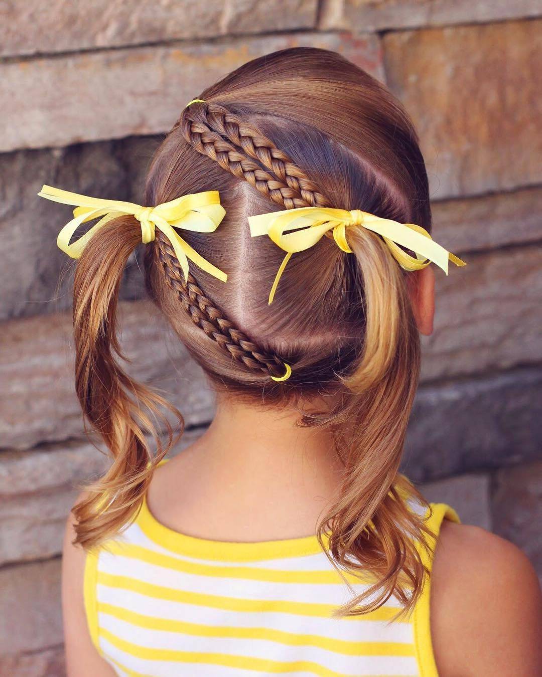 Для девчушек из начальной школы можно делать разнообразные причёски. Например, интересным вариантом станут необычные косы без плетения с бантами. Сделать такую укладку легко: