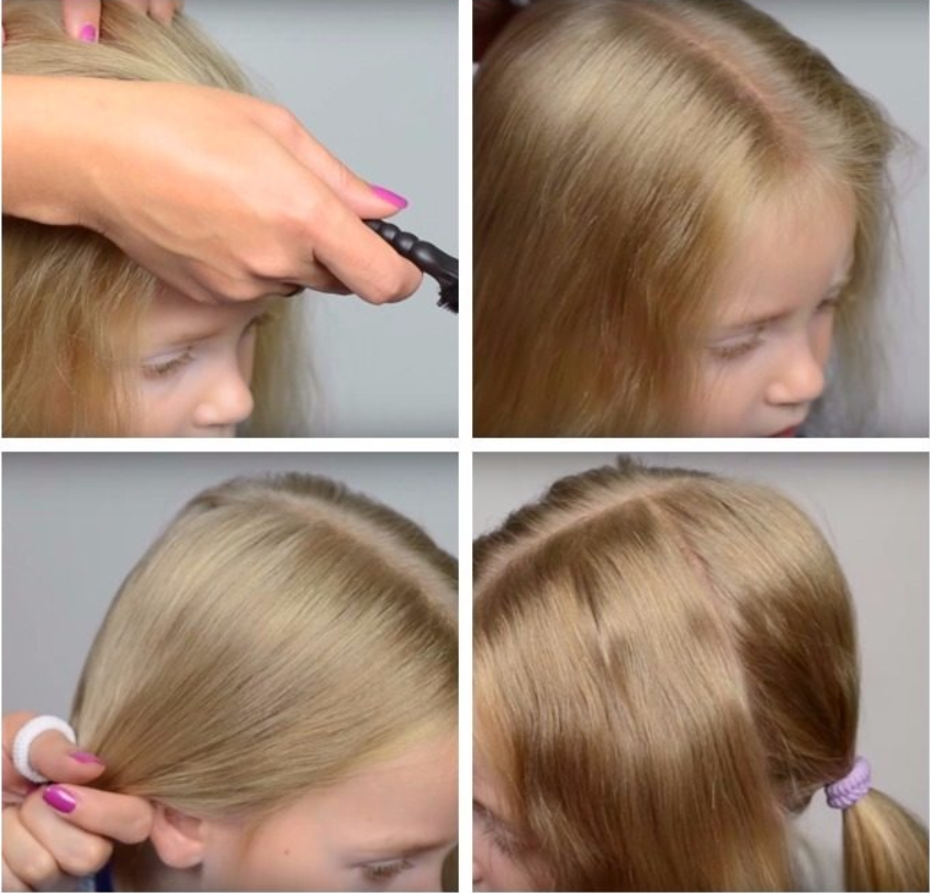 - Как и в предыдущем случае, необходимо разделить все волосы на голове на две части, то есть сделать ровный пробор. Далее собираем какую-нибудь одну сторону в хвост так, чтобы она нам не мешала. После этого приступаем к работе со второй стороной.