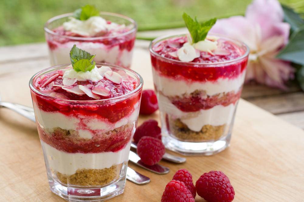 - На дно стаканов выложить измельчённое печенье. Сверху — слой творожного крема, на него — малиновый кисель. Повторить: выложить поочерёдно слой печенья, творожного крема и ягодного киселя. Украсить листочками мяты, ягодками, кремом — и ленивый чизкейк готов!