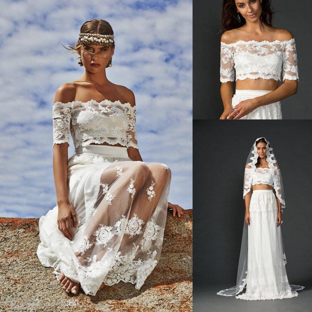 Не стоит выбирать традиционные для классических свадебных убранств парчу и тафту. Лучше остановитесь на шелке, шифоне, хлопке. Кружевные свадебные платья актуальны в любом сезоне и на любой тематической свадьбе