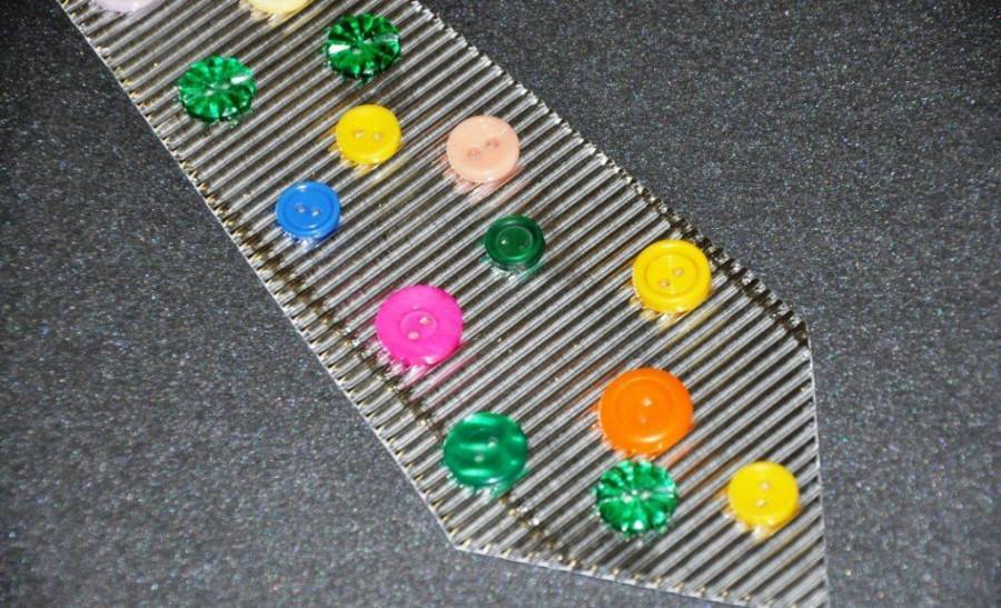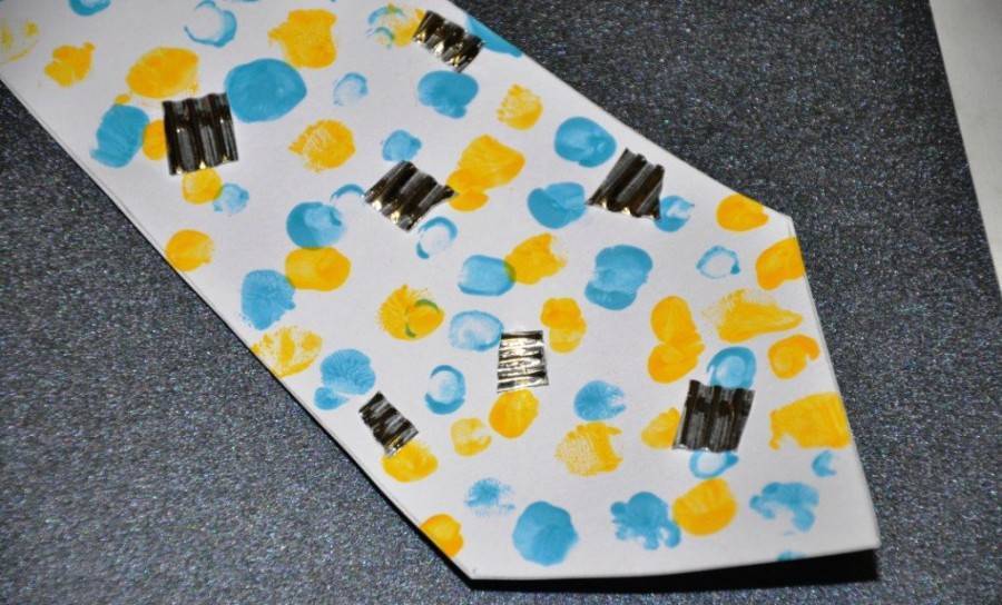 - Теперь нужно свернуть ее трубочкой и приклеить к галстуку – так получится тесьма. В конце целесообразно приклеить вырезанные картинки на лицевую сторону.