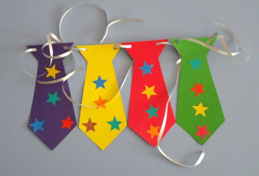 В начале надобно нарисовать на картоне галстук и звездочки (понадобятся для украшения). Потом, с помощью ножниц, необходимо это все вырезать. Теперь нужно разложить звездочки на самом галстуке и обвести их простым карандашом. С помощью дырокола делаются две дырочки для ленты, в верхней части галстука. Целесообразно подготовить салфеточные шарики, которые можно смастерить такими способами: