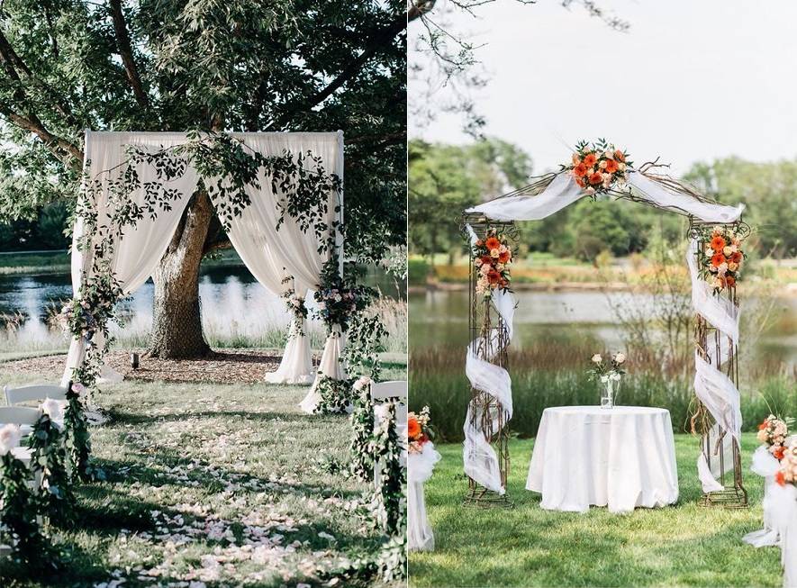 Существует не такой распространенный, но не менее интересный вариант – четырехугольная свадебная арка или квадратная. Внешне она напоминает импровизированный шатер. Оформляется легкими тканями, а ее стойки можно декорировать бусинами и лентами. При желании конструкцию можно сделать и с крышей. Семейный союз, заключенный под таким сводом, будет пылким и страстным, а пара станет жить в достатке.