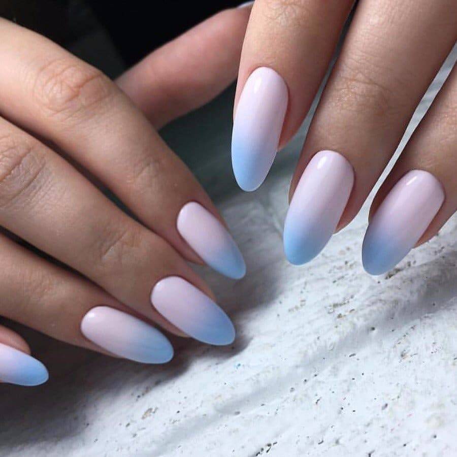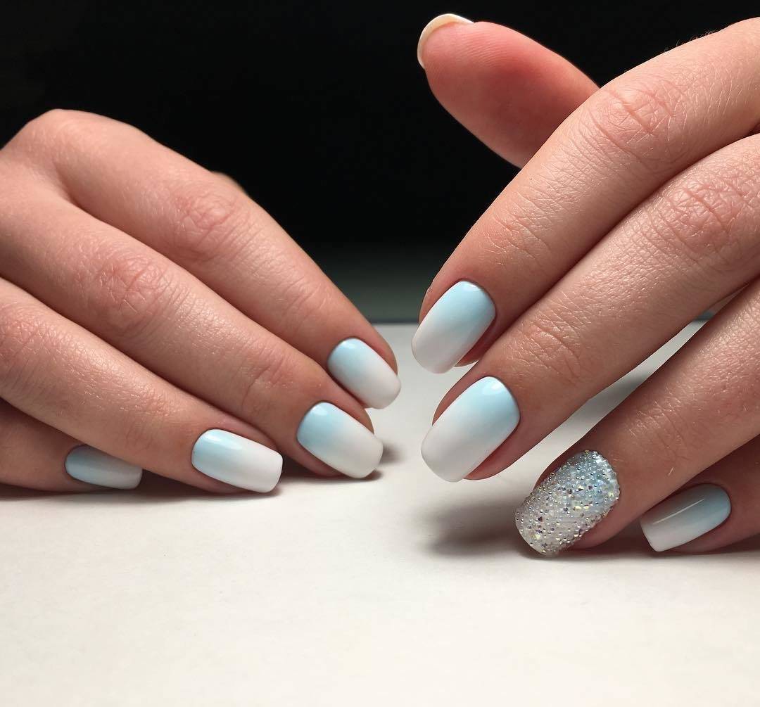 Еще одним удачным решением для невесты станет создание нейл-арта в технике омбре, когда на ногтях будет создан красивый цветовой переход: от белого к голубому.