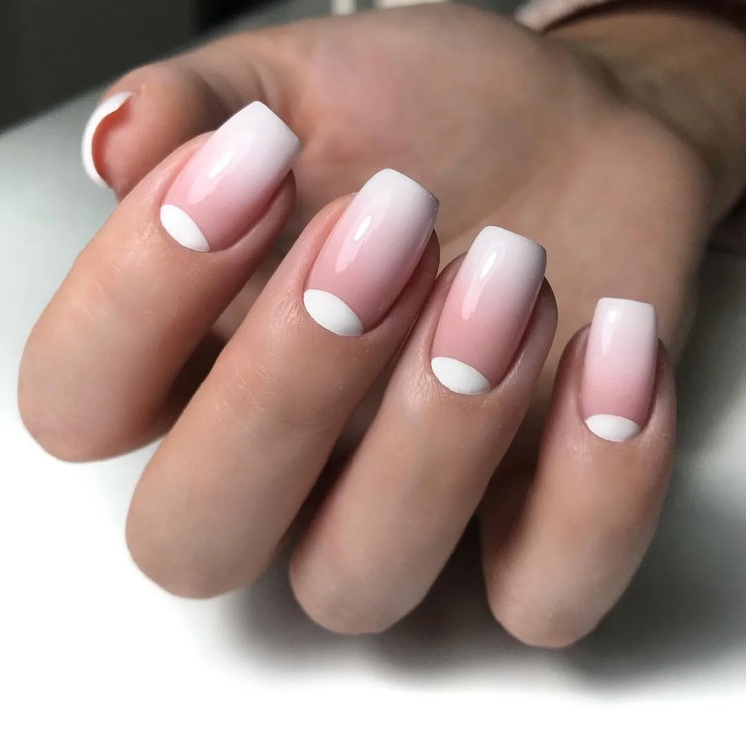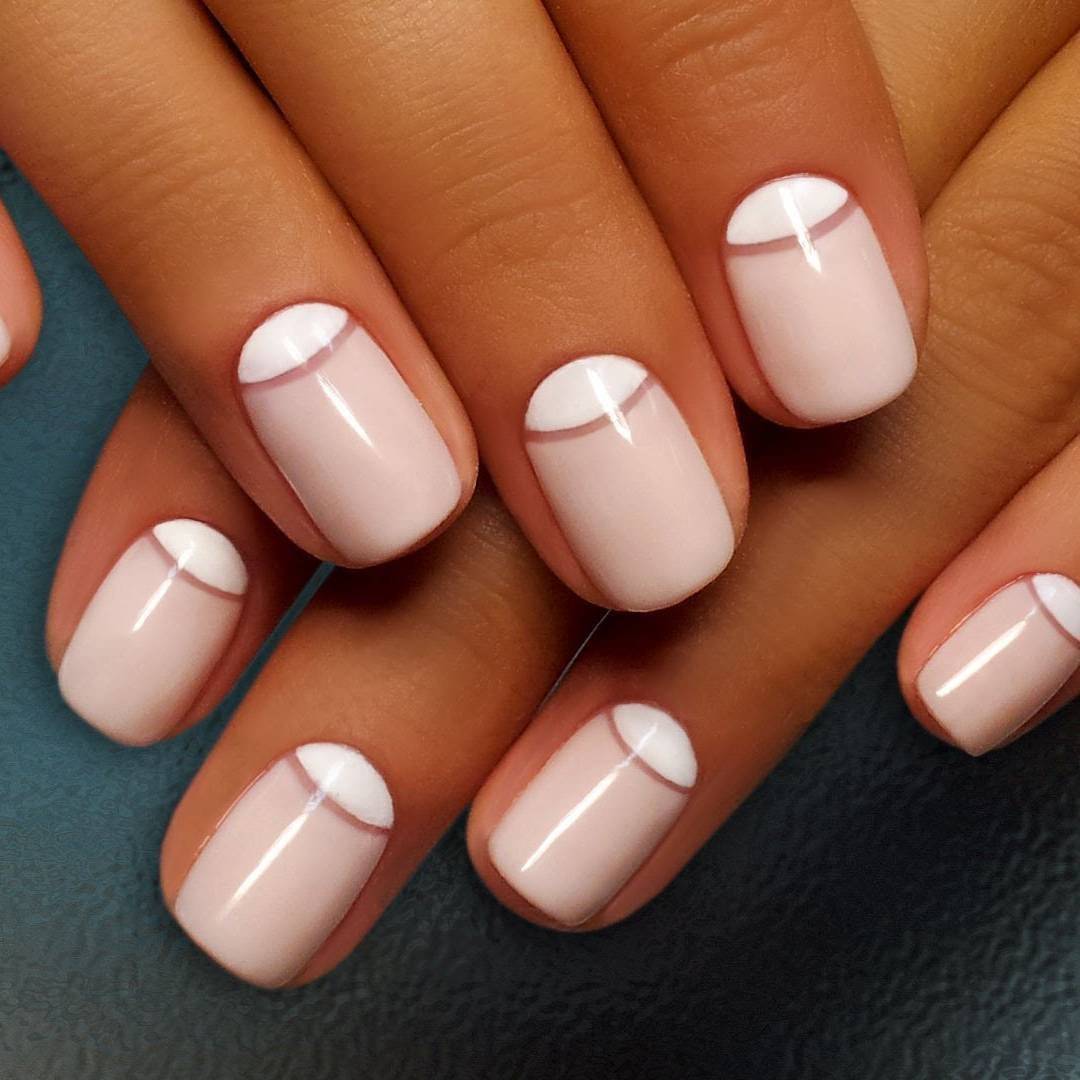 перевернутый френч, или лунный маникюр, когда контрастный полумесяц сдвигается к основанию ногтя и находится не внизу, а вверху;
