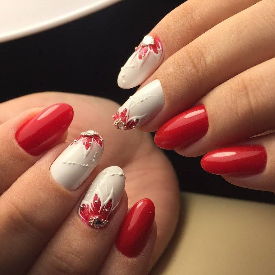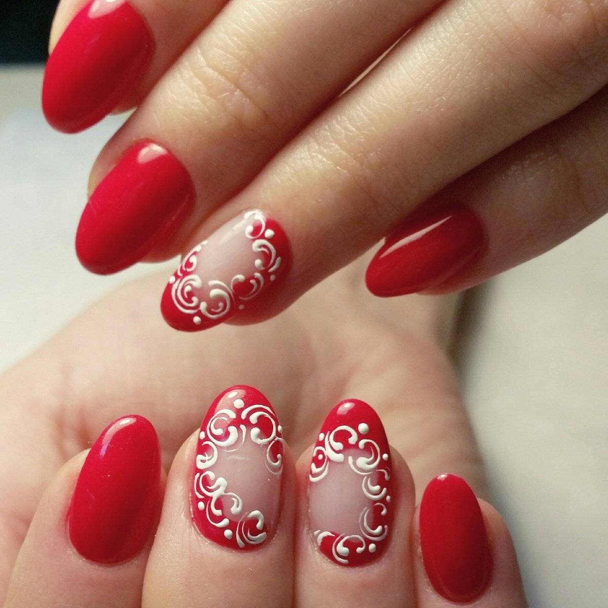 Красный маникюр может быть как в классическом однотонном варианте исполнения, так и в виде небольшого красного элемента на нюдовом или бежевом фоне. Также, очень стильно и ярко смотрится сочетание красного с белым цветом.