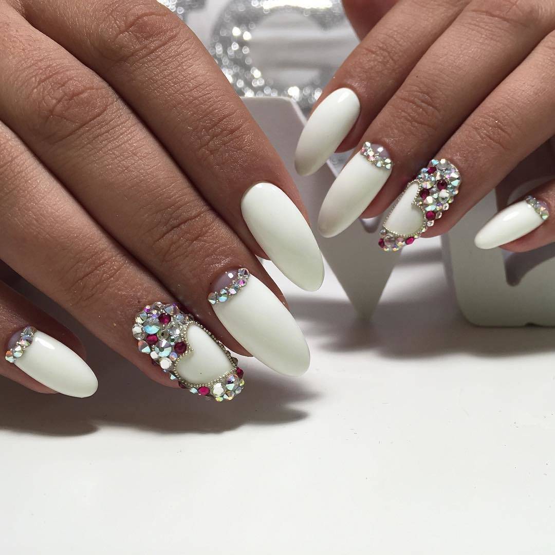 На ноготь может быть нанесено все, что блестит: это и стразы, и бульонки, и пайетки, и рассыпчатые блестки, и лаки с блестками, и кристаллы, и кабошоны, и фольга… В общем, любой переливающийся декоративный материал может использоваться в свадебном дизайне. Такой маникюр можно сделать на коротких, средних и длинных ногтях любой формы. Главное, правильно подобрать декоративные элементы и не переборщить!