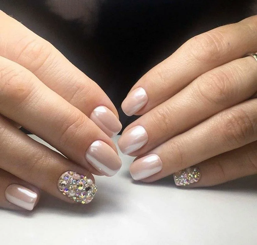 В этом году популярно все, что связано с жемчугом и перламутром. Поэтому жемчужная акриловая пудра обязательно должна быть в арсенале нейл-мастера. Такой дизайн идеально подходит для свадьбы, ведь в результате получается очень мягкий, благородный и нежный эффект. Цвет свадебного маникюра не обязательно должен быть белым. Втирка лишь придает ногтям перламутрового блеска, а подложка может быть любого цвета: бежевого, розового и даже небесного.