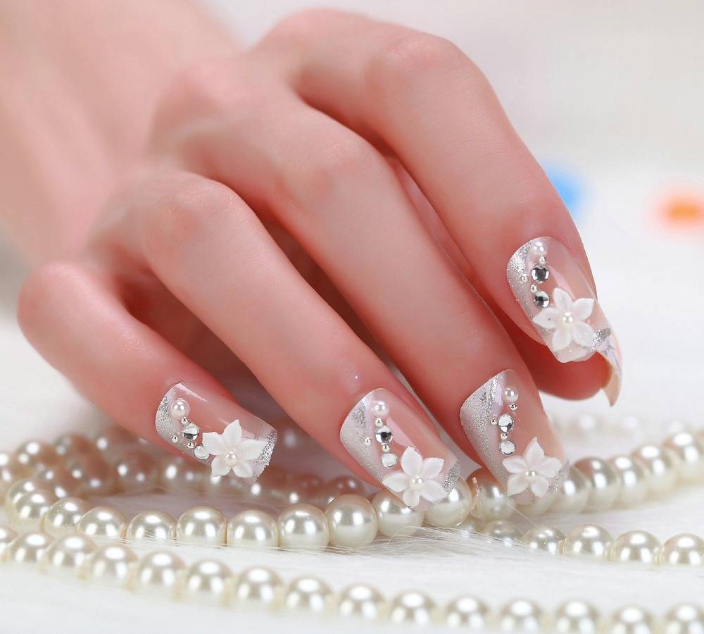 - Жемчуг. Элегантные белые бусины отлично перекликаются с аналогичным ожерельем на шее невесты, но требуют сноровки и выдержки мастера. Маникюр с жемчугом нужно крепить на ультраплотный топ, обрабатывая края тонкой оборкой дополнительной фиксации.